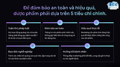 Để đảm bảo an toàn và hiệu quả, marketing dược phẩm phải dựa trên 5 tiêu chí chính: đúng thông tin – đúng phạm vi – đúng chuyên môn – đúng bối cảnh – và đúng kênh.